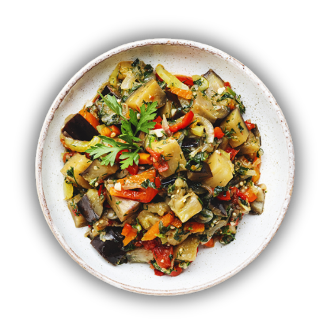Nossa famosa caponata de berinjela orgânica com pimentões de 3 cores defumados e descascados, passas negras secas , castanhas picadas e azeite extra virgem português.